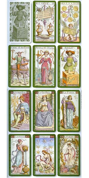 A Giovanni Vacchetta, docente universitario e mecenate vissuto alla fine dell’Ottocento, si devono questi Tarocchi, che uniscono all’eleganza del segno l’originalità delle immagini. Raffinato artista, il Maestro si cimentò in questa sua creazione come se lavorasse un blocco di marmo, scolpendo le figure per donare loro un senso di solidità materiale.