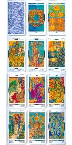 Questi Tarocchi racchiudono nella loro mistica forma messaggi al tempo stesso poetici ed esistenziali. Nelle delicate linee realizzate a tempera e pastello si scoprono infinite emozioni, come imprigionate nel fragile contorno di una vetrata.